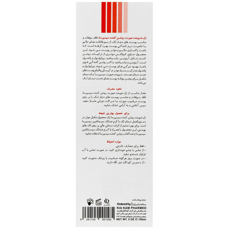ژل شستشوی صورت ضد لک سیسپرسا ترکیباتی قدرتمند و بدون سولفات داشته که برای درمان و مراقبتهای پوستی یک محصول ایده آل است؛ پوستهایی که دارای لک هستند و تحت درمان قرار دارند، بهتر است هر روز شستشو شوند تا روند درمانی سریعتر پیش رود؛ به همین منظور استفاده و خرید ضد لک قوی برای صورت، امری مهم در تسریع روند درمان است. برای این نوع پوستها، بهتر است از شویندههای ملایم ضد لک و التهاب استفاده کرد. به عنوان مثال ژل شستشوی ضد لک سیسپرسا یک محصول ایده آل برای شستشوی روزانه پوستهای دارای لک است.