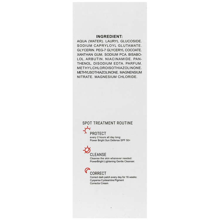 آب، لوریل گلوکوزاید، سدیم کاپریلول گلوتامات، گلیسرین، پی ای جی-۷ گلیسریل کوکوات، زانتان گام، سدیم پی سی ای، بیزابولول، آربوتین، نیاسینامید، پانتنول، دی سدیم ای دی تی ای، پارفیوم، متیل کلروایزوتیازولینول، متیل ایزوتیازولینول، منیزیم نیترات، منیزیم کلراید